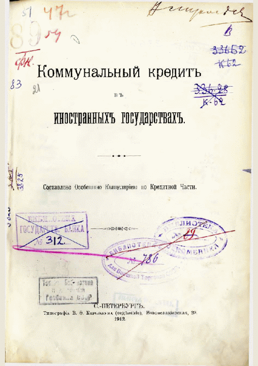 Коммунальный кредит в иностранных государствах / Министерство финансов Российской империи, Особенная канцелярия по кредитной части. — Санкт-Петербург : Типография В.О. Киршбаума, 1912. — 182 с.: табл.