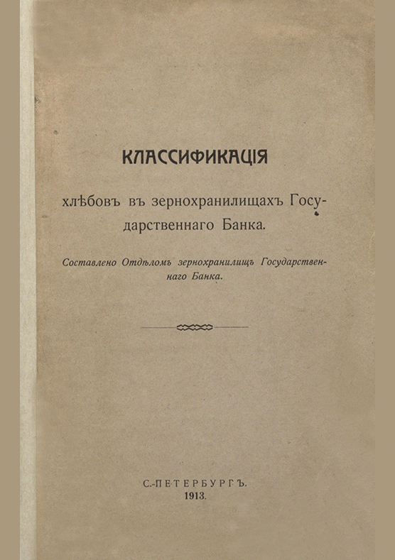 Классификация хлебов в зернохранилищах Государственного банка / Государственный банк, Отдел зернохранилищ. — Санкт-Петербург : Типография Н.Л. Ныркина, 1913. — 20 с.: обр., табл.. — . Напечатано по старой орфографии.