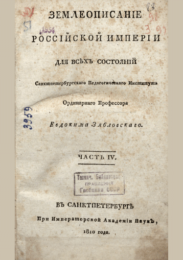 Зябловский, Е. Землеописание Российской империи. Часть IV. Губернии на особенных правах состоящие и области : для всех состояний / Е. Зябловский. — Прижизн. изд.. — Санкт-Петербург : При Императорской Академии Наук, 1810. — 558-466 с.. — . Напечатано по старой орфографии.. — 30.00 р.