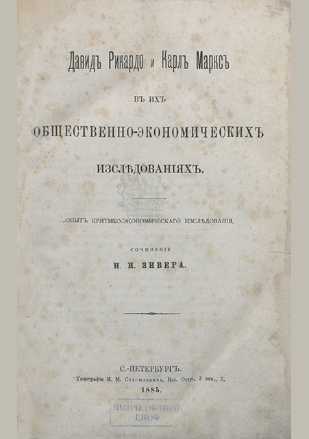 Зибер, Н.И. Давид Рикардо и Карл Маркс в их общественно-экономических исследованиях : опыт критико-экономического исследования / Н. И. Зибер. — Санкт-Петербург : Тип. М.М. Стасюлевича, 1885. — VIII, 598 с.. — . Напечатано по старой орфографии.