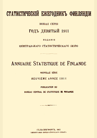 Статистический ежегодник Финляндии, Annuaire Statistique de Finlande. Новая серия. Год девятый 1911 / Центральное статистическое бюро. — Электрон. текстовые дан.. — Гельсингфорс : Типография Императорского Сената, 1911. — 564 с.. — . Напечатано по старой орфографии.