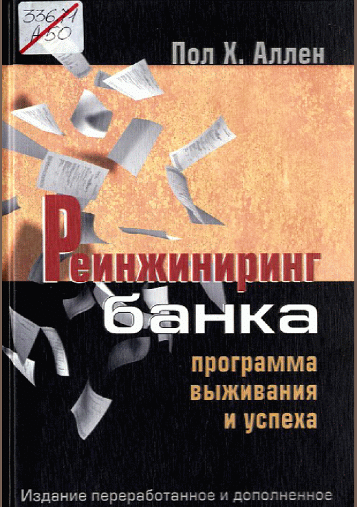 Аллен, П.Х. Реинжиниринг банка: программа выживания и успеха : Пер. с англ. / П. Х. Аллен. — Изд. перераб. и доп.. — Москва : Альпина Паблишер, 2002. — 263 с.. — Перевод издания: Reengineering the Bank: A Blueprint for Survival and Success. — (в пер.) : 472.50 р.