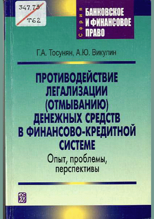 Тосунян, Г.А. Противодействие легализации (отмыванию) денежных средств в финансово-кредитной системе : Опыт, проблемы, перспективы / Г.А. Тосунян, А.Ю. Викулин. — Москва : Дело, 2001. — 256 с.. — (Банковское и финансовое право). — 129.60 р.