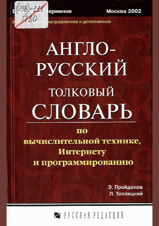 Пройдаков, Э.М. Англо-русский толковый словарь по вычислительной технике, Интернету, и программированию : Более 9600 терминов / Э.М. Пройдаков, Л.А. Теплицкий. — Изд. 3-е, испр. и доп.. — Москва : "Русская редакция", 2002. — 640 с.. — 213.75 р.
