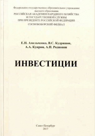 Инвестиции : учебное пособие для вузов / Е. Н. Амельченко, В. С. Кудряшов, А. А. Куприн, А. П. Родионов; Российская академия народного хозяйства и государственной службы при Президенте Российской Федерации. — Санкт-Петербург : Астерион, 2017. — 181 с.: ил.. — Библиогр. в конце глав. — ISBN 978-5-00045-511-1.