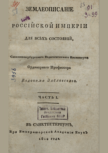 Зябловский, Е. Землеописание Российской империи. Часть I. Содержащая в себе границы Государства, его пространство, воды, климат, качество почвы и примечательнейшие произведения из всех трех царств природы : для всех состояний / Е. Зябловский. — Прижизн. изд.. — Санкт-Петербург : При Императорской Академии Наук, 1810. — LXIV, 110 с.. — . Напечатано по старой орфографии.. — 30.00 р.