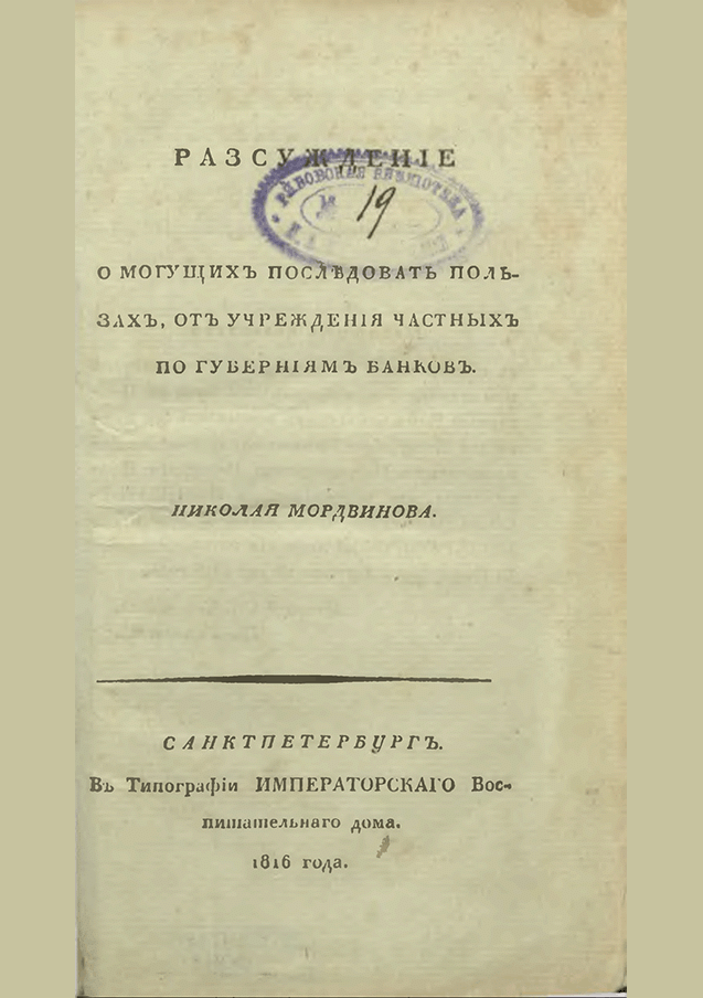 Мордвинов, Н.С. Рассуждение о могущих последовать пользах, от учреждения частных по губерниям банков / Н. Мордвинов. — Санкт-Петербург : Типография Императорского воспитательного дома, 1816. — 124 с.. — . Напечатано по старой орфографии.