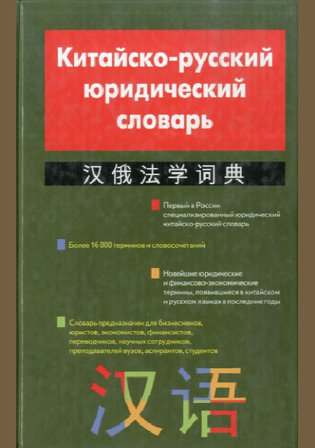 Китайско-русский юридический словарь: право, экономика, финансы / Н. Х. Ахметшин, Го Цюнь, Ли Дэпин [и др.]; редакторы: Н. Х. Ахметшин, Ли Дэпин. — Москва : Восток-Запад, 2005. — 687 с.. — ISBN 5-478-00044-2.
