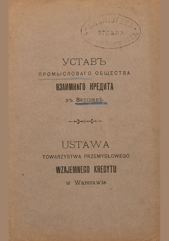Устав Промыслового общества взаимного кредита в Варшаве, Ustawa Towarzystwa Przemyslowego Wzajemnego Kredytu w Warszawie : утвержден 16 августа 1908 г. / Промысловое общество взаимного кредита. — [Warszawa] : Zaklady druk. lit. M. Oberfelda, [1908]. — 75 с.. — . Напечатано по старой орфографии. Текст на русс. и польск. яз.