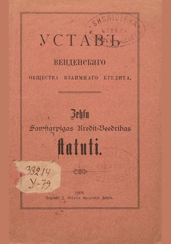 Устав Венденского общества взаимного кредита / Венденское общество взаимного кредита. — Венден, 1908. — 64 с.. — . Напечатано по старой орфографии; текст дан на рус. и лат. языках.