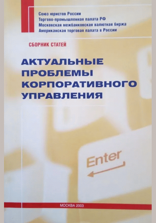 Актуальные проблемы корпоративного управления : сборник статей / Союз юристов России [и др.]; редакторы: А. В. Захаров, Г. И. Лунтовский ; составители: С. А. Голубев, Е. И. Воронина. — Москва : Юстицинформ, 2003. — 288 с.. — ISBN 5-7205-0504-0.
