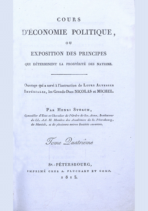 Storch, H. Cours d’économie politique, ou exposition des principes qui déterminent la prospérité des nations. Т. 4 : Ouvrage qui a servi a l'instruction de Leurs Altesses Imperiales, les Grands-Ducs Nicolas et Michel / H. Storch. — Прижизн. изд.. — St.-Petersbourg : Imprimé chez A. Pluchart et Comp., 1815. — III, 358 p.