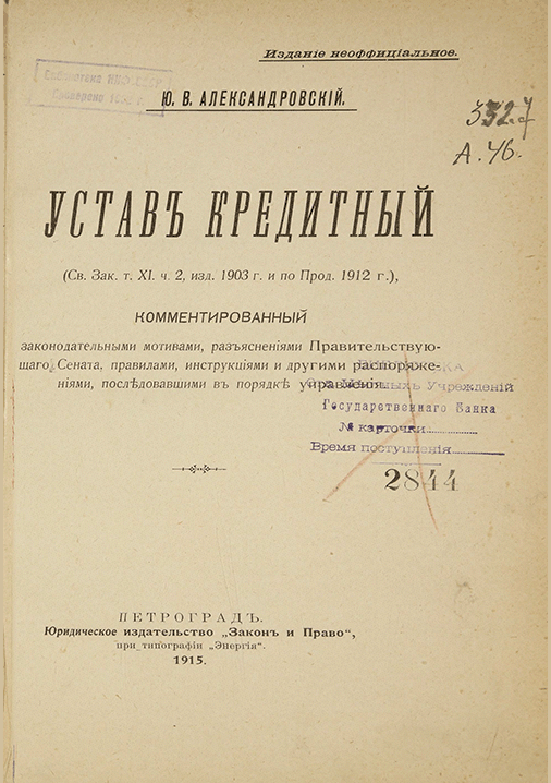 Александровский, Ю.В. Устав кредитный : комментированный законодательными мотивами, разъяснениями Правительствующего Сената, правилами, инструкциями и другими распоряжениями, последовавшими в порядке управления / Ю. В. Александровский. — изд. не официальное. — Петроград : Закон и право : Типография Энергия, 1915. — 81 с.. — Алф.-Предм. указ.: с. 12-39.