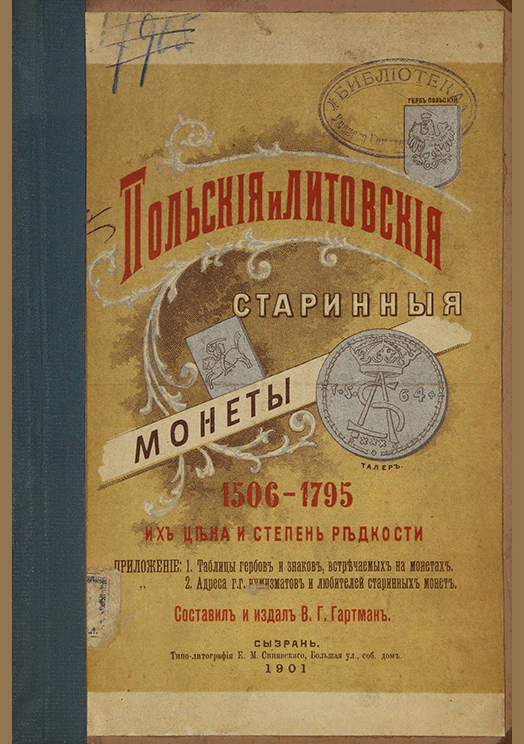 Польские и литовские старинные монеты 1056-1795 : их цена и степень редкости / составитель и издатель В. Г. Гартман. — Сызрань : Типо-литография Е.М. Синявского, 1901. — 169 с.: табл.