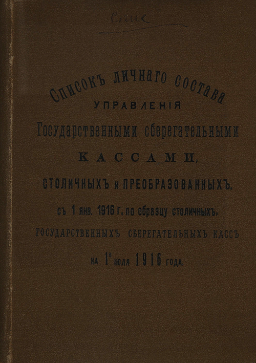 Список личного состава Управления Государственными сберегательными кассами : столичных и преобразованных, с 1 янв. 1916 г., по образцу столичных, Государственных сберегательных касс и состава Совета по делам страхования доходов и капиталов и Комитета Государственных сберегательных касс на 1 мая 1916 года. — [Санкт-Петербург] : [Государственный Банк], Б.г.. — 417 с.: табл.. — Алф. указ.: с. 392-413.