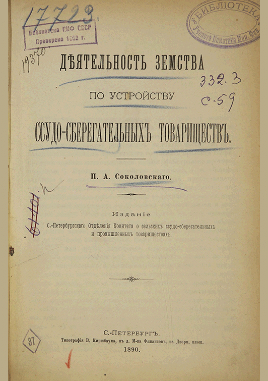 Соколовский, П.А. Деятельность земства по устройству ссудо-сберегательных товариществ / П. А. Соколовский; Комитет о сельских ссудо-сберегательных и промышленных товариществах, Санкт-Петербургское отделение. — Санкт-Петербург : Тип. В. Киршбаума, 1890. — 369 с.: табл.. — Алф. указ.: с. 12.