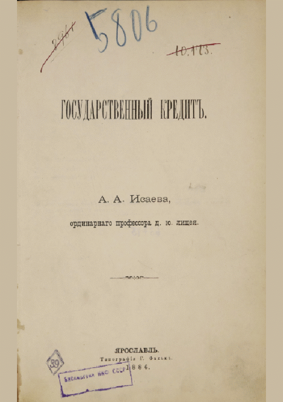 Исаев, А.А. Государственный кредит / А. А. Исаев. — Ярославль : Типография Г. Фальк, 1886. — 174 с.. — Библиогр. в конце глав.