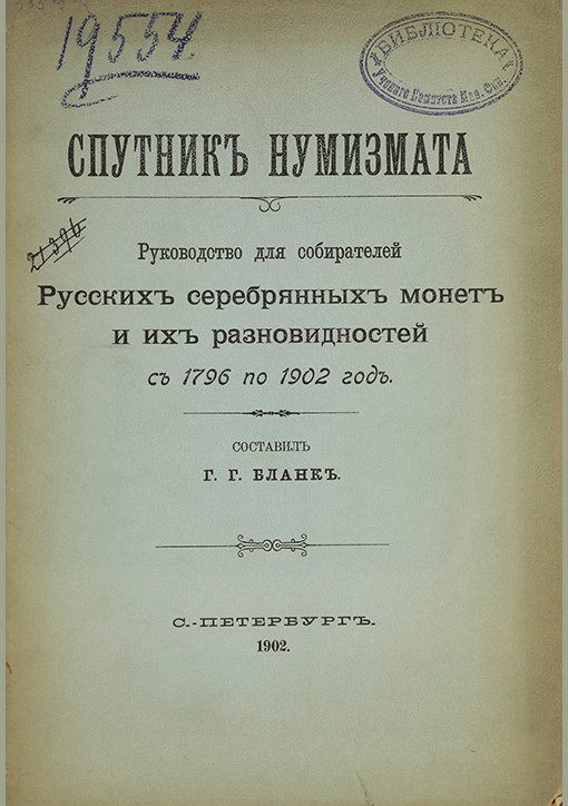 Спутник нумизмата : руководство для собирателей русских серебряных монет и их разновидностей с 1796 по 1902 год / составитель Г. Г. Бланк. — Санкт-Петербург : Типография Г. Шахт и Ко, 1902. — 69 с.: табл.