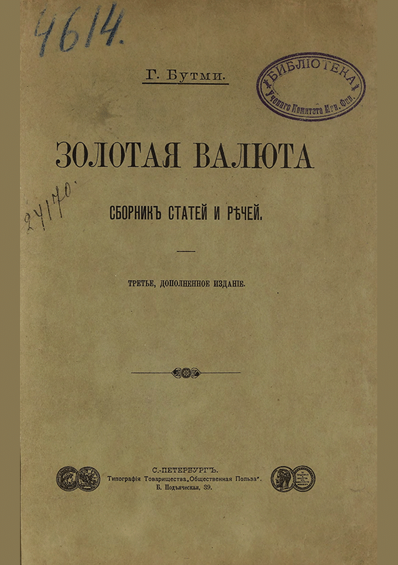- 1. Бутми, Г.В. К вопросу о денежной реформе / Г. Бутми. — Одесса : Типография Труд, 1896. — 35 с.