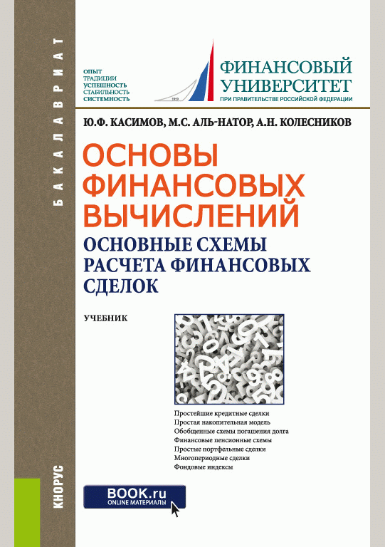 Касимов, Ю.Ф. Основы финансовых вычислений. [Ч. 1,2] : основные схемы расчета финансовых сделок : учебник для вузов / Ю. Ф. Касимов, М. С. Аль-Натор, А. Н. Колесников; Финансовый университет при Правительстве Российской Федерации. — Москва : КноРус, 2021. — 328 с.: ил.. — (Бакалавриат). — Библиогр.: с. 327-328. — ISBN 978-5-406-02348-8.