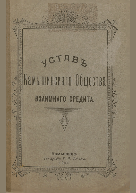 Устав Камышинского общества взаимного кредита : утвержден 27 апреля 1900 г. / Камышинское общество взаимного кредита. — Камышин : Типография Г.И. Фадеева, 1904. — 35 с.. — . Напечатано по старой орфографии.