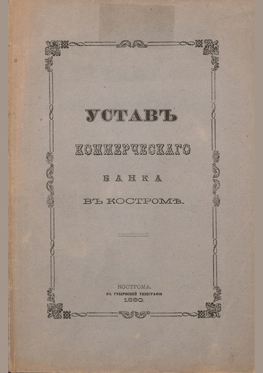 Устав Коммерческого банка в Костроме : утвержден 21 мая 1871 года: с 2 приложениями об изменении и дополнении некоторых параграфов Устава, утвержденных г. Министром финансов / Коммерческий банк в Костроме. — Кострома : Губернская типография, 1890. — 43 с.. — . Напечатано по старой орфографии.