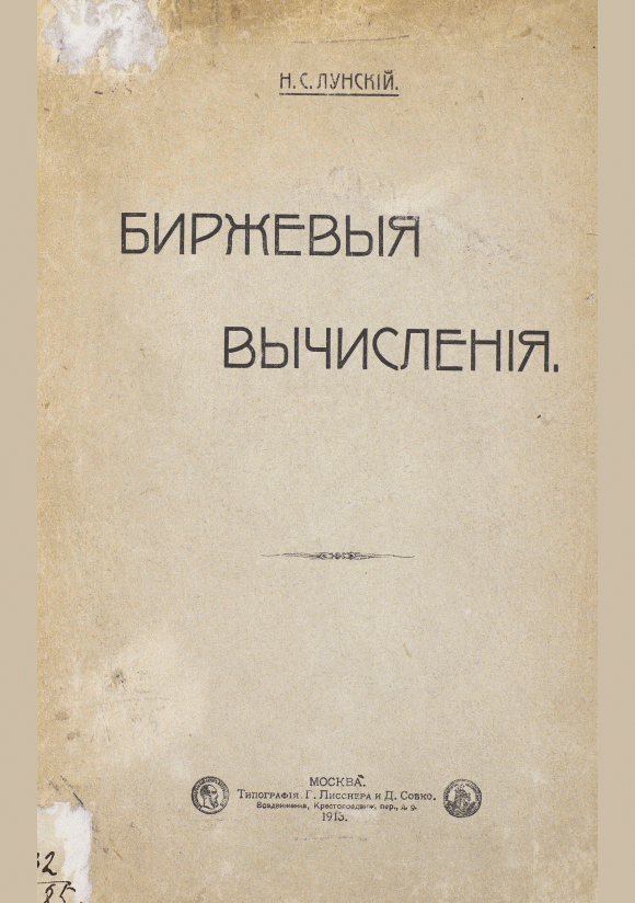 Лунский, Н.С. Биржевые вычисления / Н. С. Лунский. — Москва : Типография Г. Лисснера и Д. Собко, 1913. — 51 с.. — . Отдельный оттиск из "Известий Московского Коммерческого Института", кн. I, 1913.