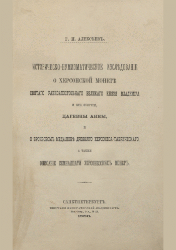 Алексеев, Г.П. Историко-нумизматическое исследование о херсонской монете святого Равноапостольного великого князя Владимира и его супруги, царевны Анны, и о бронзовом медальоне древнего Херсонеса-Таврического, а также описание семнадцати херсонесских монет / Г. П. Алексеев. — Санкт-Петербург : Типография Императорской Академии наук, 1886. — 74 с.+ 2л. прилож. с фот. монет. — . Напечатано по старой орфографии.