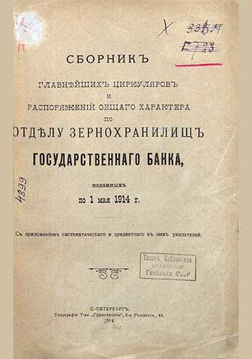 Сборник главнейших циркуляров и распоряжений общего характера по отделу зернохранилищ Государственного банка, изданных по 1 мая 1914 г. : с приложением систематического и предметного к ним указателей / Государственный банк, Отдел зернохранилищ. — Санкт-Петербург : Типография Товарищества "Грамотность", 1914. — LVIII, 326, 150 с.: обр., формы, рис.. — . Напечатано по старой орфографии.. Сист. указ.: с. V-XLII.