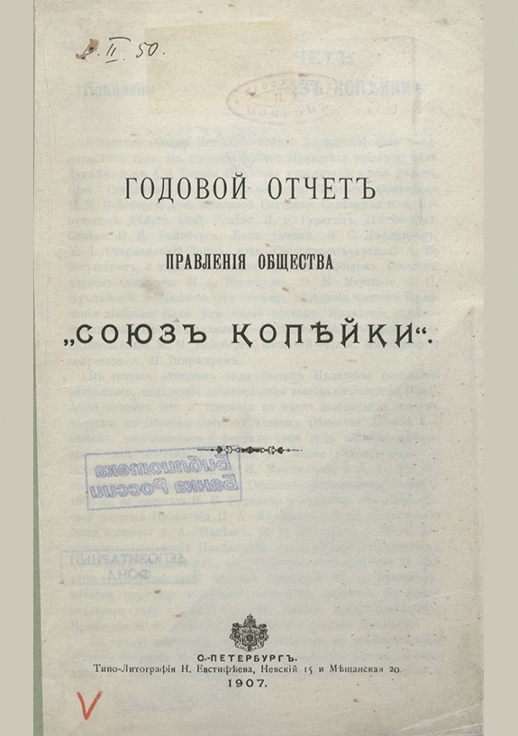 Годовой отчет Правления Общества "Союз копейки" / Общество "Союз копейки". — Санкт-Петербург : Типо-Литография Н. Евстифеева, 1907. — 16 с.: табл.. — . Напечатано по старой орфографии.