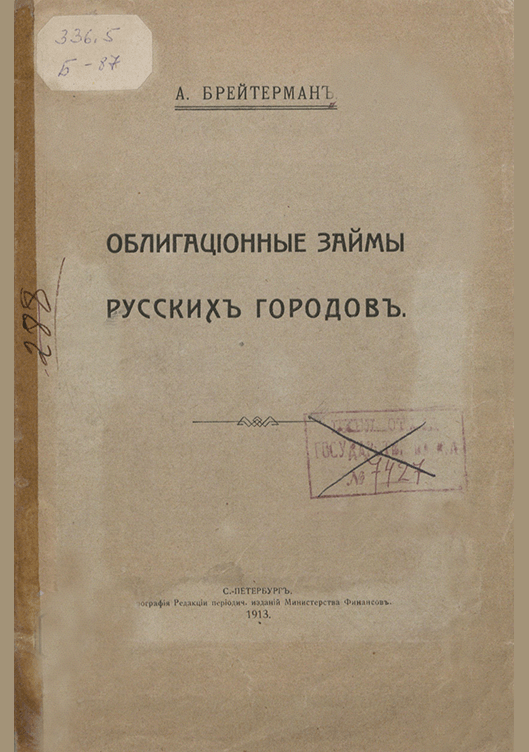Брейтерман, А.Д. Облигационные займы русских городов / А. Д. Брейтерман. — Санкт-Петербург : Типография Редакции периодических изданий Министерства Финансов, 1913. — 62 с.: табл.. — . Напечатано по старой орфографии.