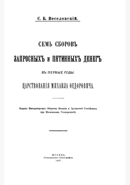 Веселовский, С.Б. Семь сборов запросных и пятинных денег в первые годы царствования Михаила Федоровича / С. Б. Веселовский. — Москва : Издание Императорского общества истории и древностей российских при Московском университете, 1908. — 233 с.. — . Напечатано по старой орфографии. — ISBN 978-5-4460-1645-7 (эл. изд.) : 20.00 р.