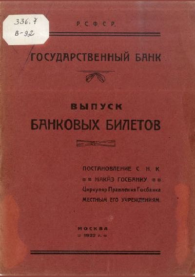 Выпуск банковых билетов : постановление СНК "Наказ Госбанку". Циркуляр Правления Госбанка местным его учреждениям / Государственный банк РСФСР. — Москва : Издание Госбанка РСФСР, 1922. — 28 с.
