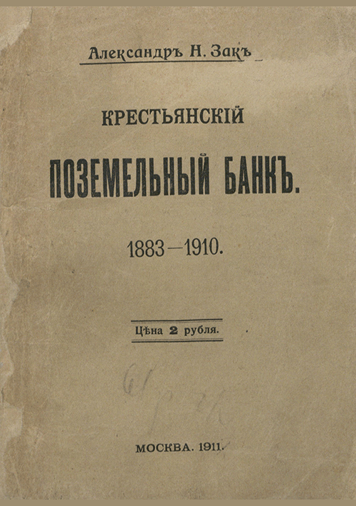 Зак, А.Н. Крестьянский поземельный банк. 1883-1910 / А. Н. Зак. — Москва : Т-во скоропеч. А.А. Левенсон, 1911. — ХІІ, 607 с.. — . Напечатано по старой орфографии. Указ.: с. 584-607.