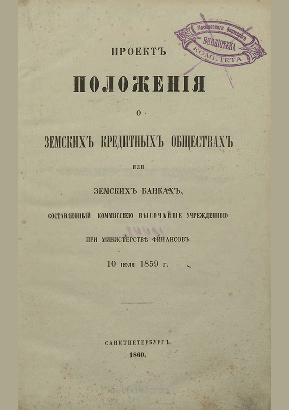 Проект Положения о земских кредитных обществах или земских банках : составлен 10 июля 1859 г. / Комиссия Высочайше учрежденная при Министерстве финансов. — Санкт-Петербург, 1860. — LXXX, 160 с.. — . Напечатано по старой орфографии.