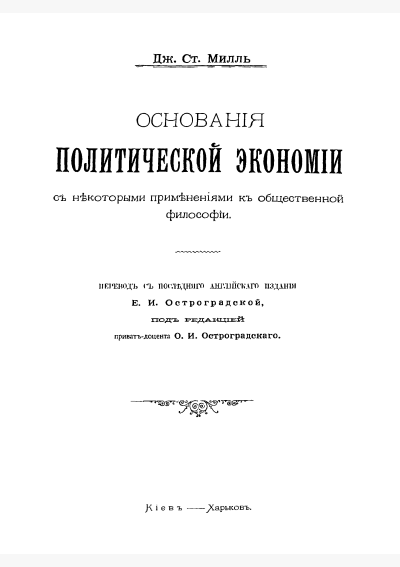 Милль, Д.С. Основания политической экономии с некоторыми применениями к общественной философии / Д. С. Милль; перевод с английского Е. И. Остроградская; редактор О. И. Остроградский. — КиевХарьков : Южно-Русское Книгоиздательство Ф.А. Йогансона, 1896. — 901 с.. — . Напечатано по старой орфографии. — ISBN 978-5-4458-2418-3.