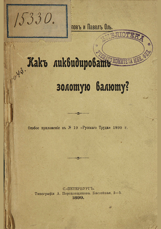 Шарапов, С.Ф. Как ликвидировать золотую валюту? : Особое приложение к № 19 "Русского труда" 1899 г. / С. Шарапов, П. Оль. — Санкт-Петербург : Типография А. Пороховщикова, 1899. — 36 с.. — . Напечатано по старой орфографии.