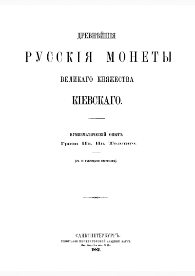 Толстой, И.И. Древнейшие русские монеты Великого княжества Киевского / И. И. Толстой. — Санкт-Петербург : Типография Императорской академии наук, 1882. — 317 с.: табл.. — . Напечатано по старой орфографии. — ISBN 978-5-9989-9417-3 : 1000.00 р.