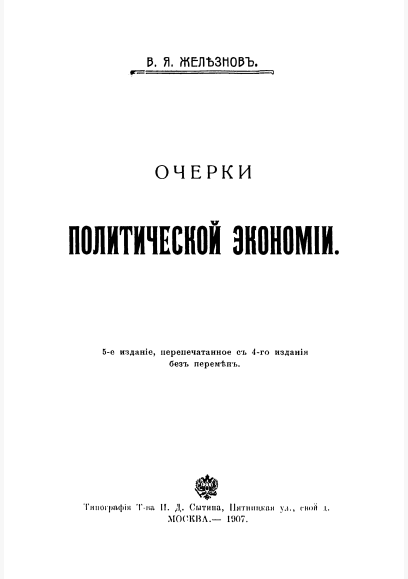 Железнов, В.Я. Очерки политической экономии / В. Я. Железнов. — 5-е изд.. — Москва : Типография товарищества И.Д. Сытина, 1907. — 842 с.. — (Библиотека для самообразования). — . Напечатано по старой орфографии. — ISBN 978-5-4460-9501-8 : 1000.00 р.