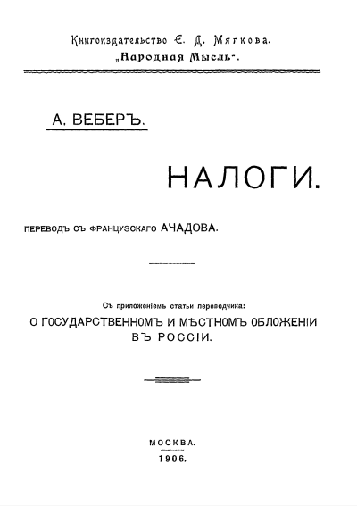 Вебер, А. Налоги / А. Вебер; перевод с французского [Н. А.] Ачадов. — Москва : Народная мысль, 1906. — 84 с.: табл.. — . Напечатано по старой орфографии. Содержание : О государственном и местном обложении в России/ автор приложения Ачадов [Н.А.]. — ISBN 978-5-4475-2433-3 : 1000.00 р.