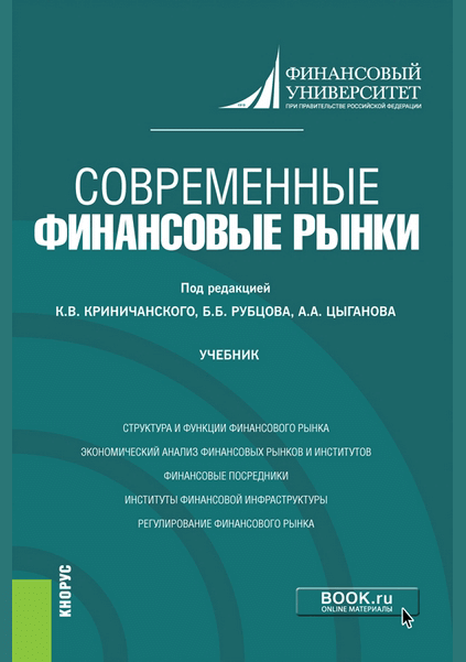 Современные финансовые рынки : учебник для вузов / Финансовый университет при Правительстве Российской Федерации; редакторы: К. В. Криничанский [и др.]. — Москва : КноРус, 2021. — 600 с.: ил.. — (Магистратура). — Библиогр.: с. 577-600. — ISBN 978-5-406-08409-0.