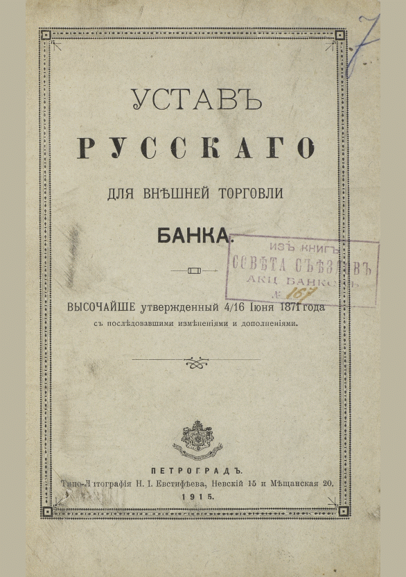 Устав Русского для внешней торговли банка : Высочайше утвержденный 4/16 июня 1871 года / Русский для внешней торговли банк. — С последовавшими изм. и доп.. — Петроград, 1915. — 36 с.: вкл.л.- 1. — . Напечатано по старой орфографии. — 10.00 р.