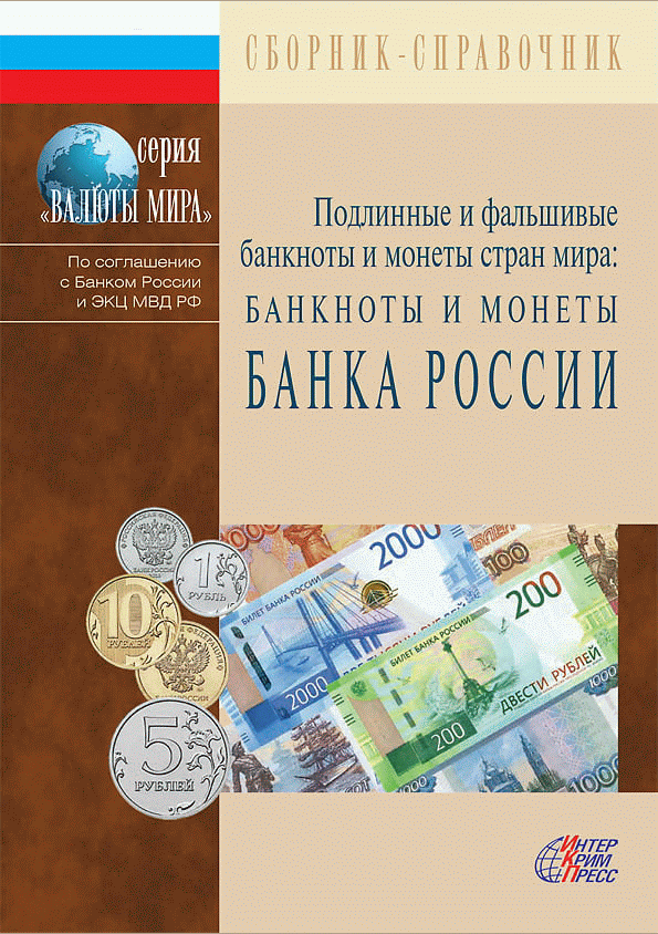 Подлинные и фальшивые банкноты и монеты стран мира : банкноты и монеты Банка России / Центральный банк Российской Федерации. — 22-е изд., испр. и доп.. — Москва : Интеркрим-Пресс, 2022. — 112 с.: цв. ил.. — (Валюты мира). — ISBN 978-5-9286-0246-8 : 2210.00 р.