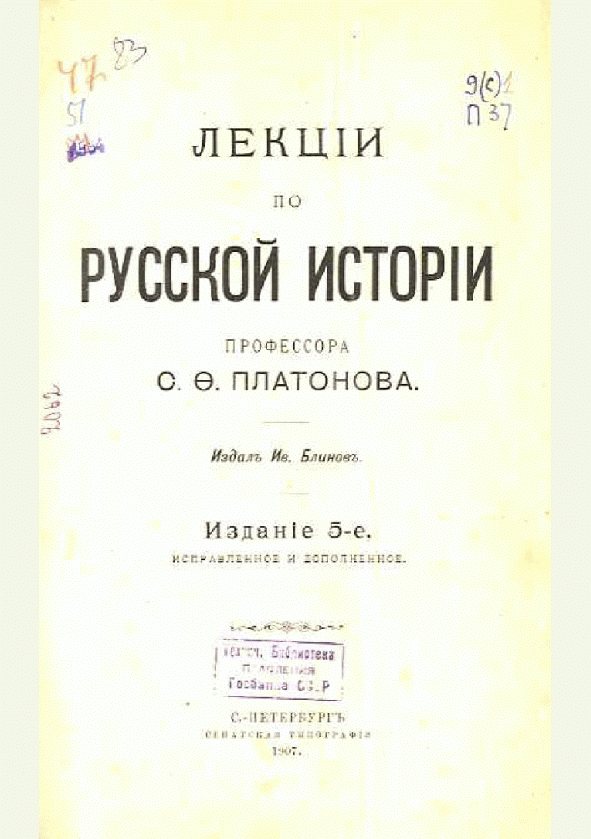 Платонов, С.Ф. Лекции по русской истории / С.Ф. Платонов. — 5-е изд., испр. и доп.. — Санкт-Петербург : Издал И. Блинов, 1907. — 651 с.. — . Напечатано по старой орфографии. — (в пер.) : 60.00 р.