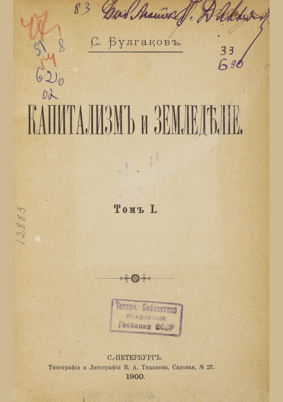 Булгаков, С.Н. Капитализм и земледелие. Т. 1 / С. Булгаков. — Санкт-Петербург, 1900. — 338, IV с.. — . Напечатано по старой орфографии. — 59.00 р.