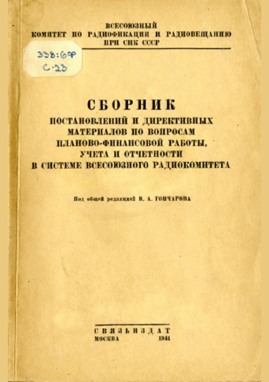 Сборник постановлений и директивных материалов по вопросам планово-финансовой работы, учета и отчетности в системе Всесоюзного радиокомитета / Под общ. ред. В.А. Гончарова; Всесоюз. Комитат по радиовещанию при СНК СССР. — Москва : Связьиздат, 1941. — 142 с.. — 4.25 р.