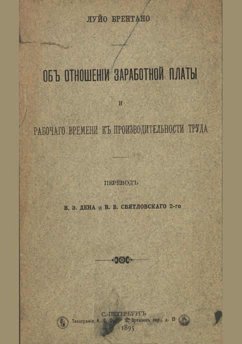 Брентано, Л. Об отношении заработной платы и рабочего времени к производительности труда / Л. Брентано; пер.: В. В. Святловский, В.Э. Ден. — С.-Петербург, 1895. — XII, 78 с.. — . Напечатано по старой орфографии. — 10.00 р.