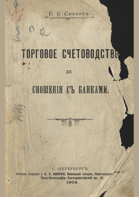 Сиверс, Е.Е. Торговое счетоводство и сношения с банками / Е. Е. Сиверс. — Санкт-Петербург : Книгоиздательство А.Э. Винеке, 1904. — 391, X с.. — . Напечатано по старой орфографии. — 10.00 р.