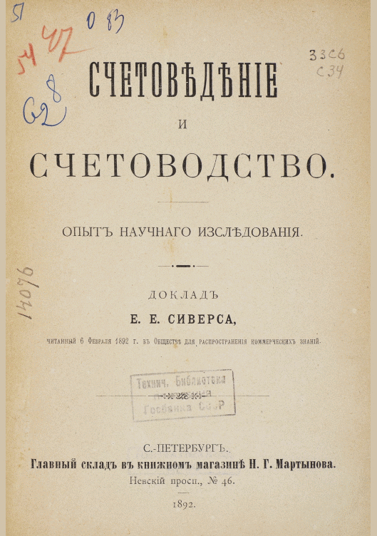 Сиверс, Е.Е. Счетоведение и счетоводство : опыт научного исследования: доклад, читаный 6 февраля 1892 года в Обществе для распространения коммерческих знаний / Е. Е. Сиверс. — Санкт-Петербург : Главный склад в книжном магазине Н.Г. Мартынова, 1892. — 69 с.. — . Напечатано по старой орфографии. — 10.00 р.