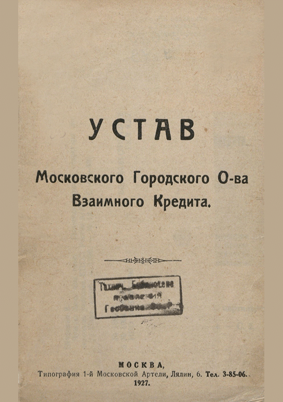 Устав Московского Городского Общества Взаимного Кредита : Утв. Зам. Наркомфина Р. Левиным. — Москва : Типография 1-ой Московской Артели, 1927. — 40 с.